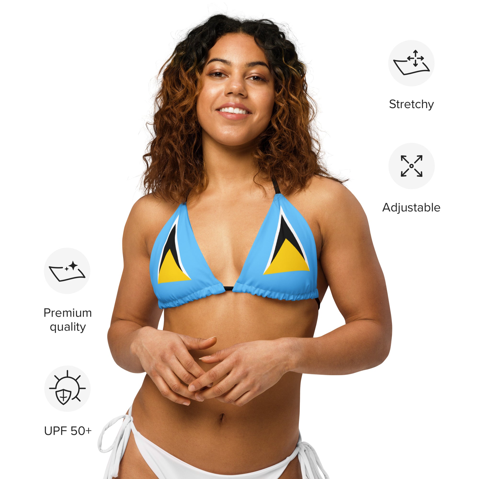 Represent St. Lucia with this Padded String Bikini Top designed with the St. Lucia flag in mind. The top is has removable padding for comfort and is available in sizes from 2XS to 6XL. Be patriotic with your daily routine.