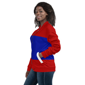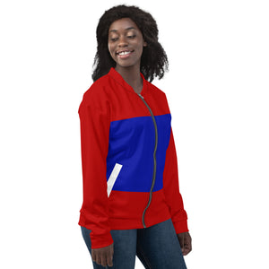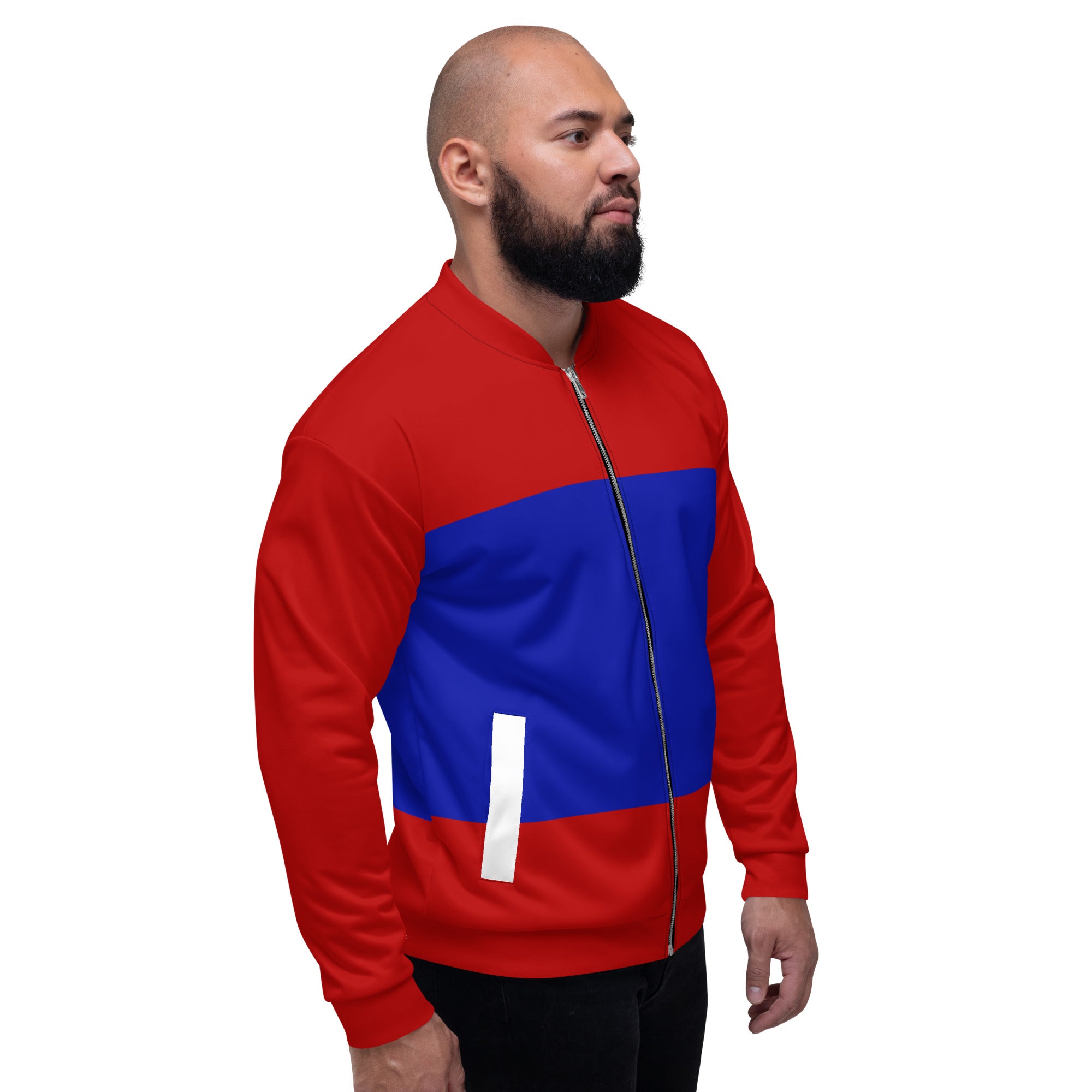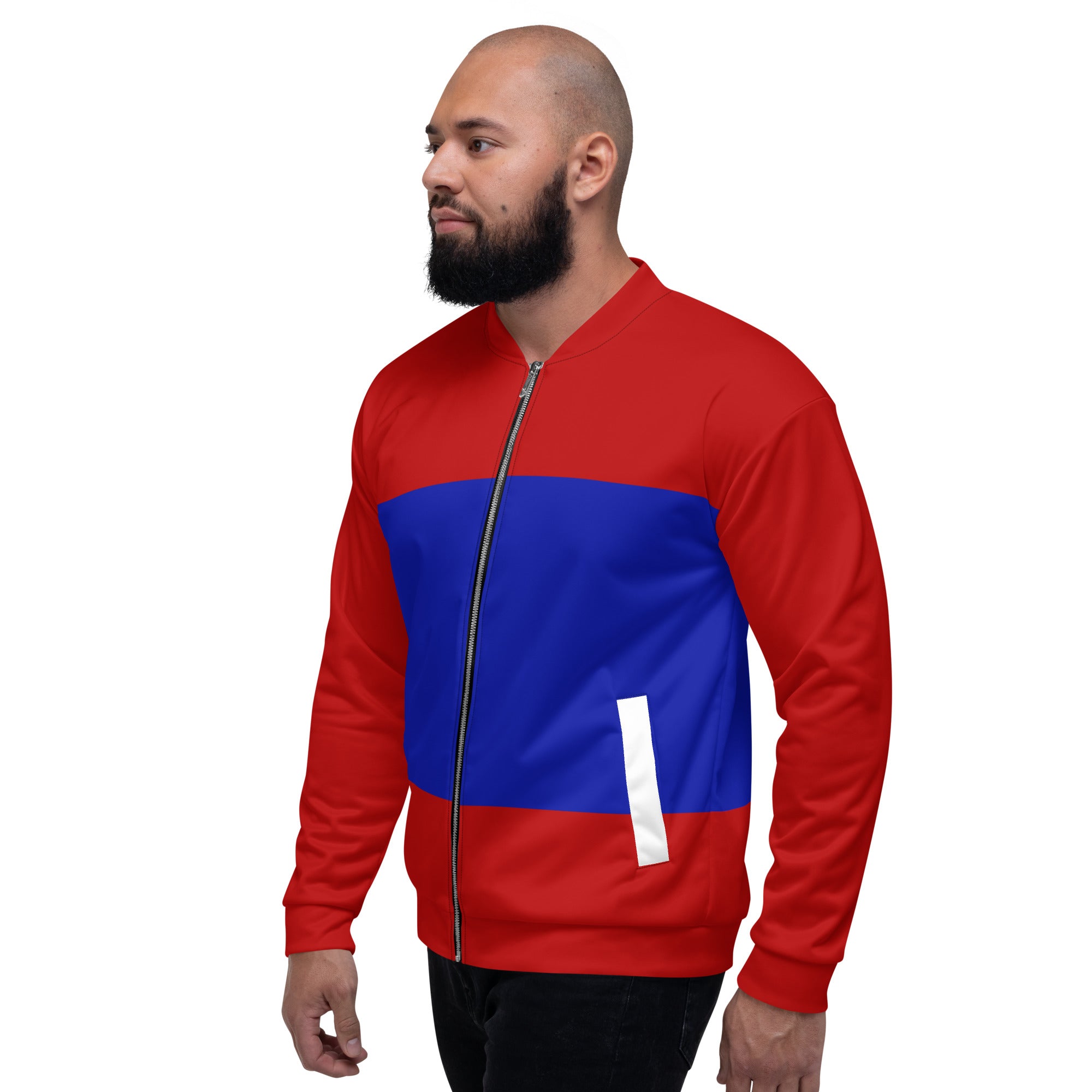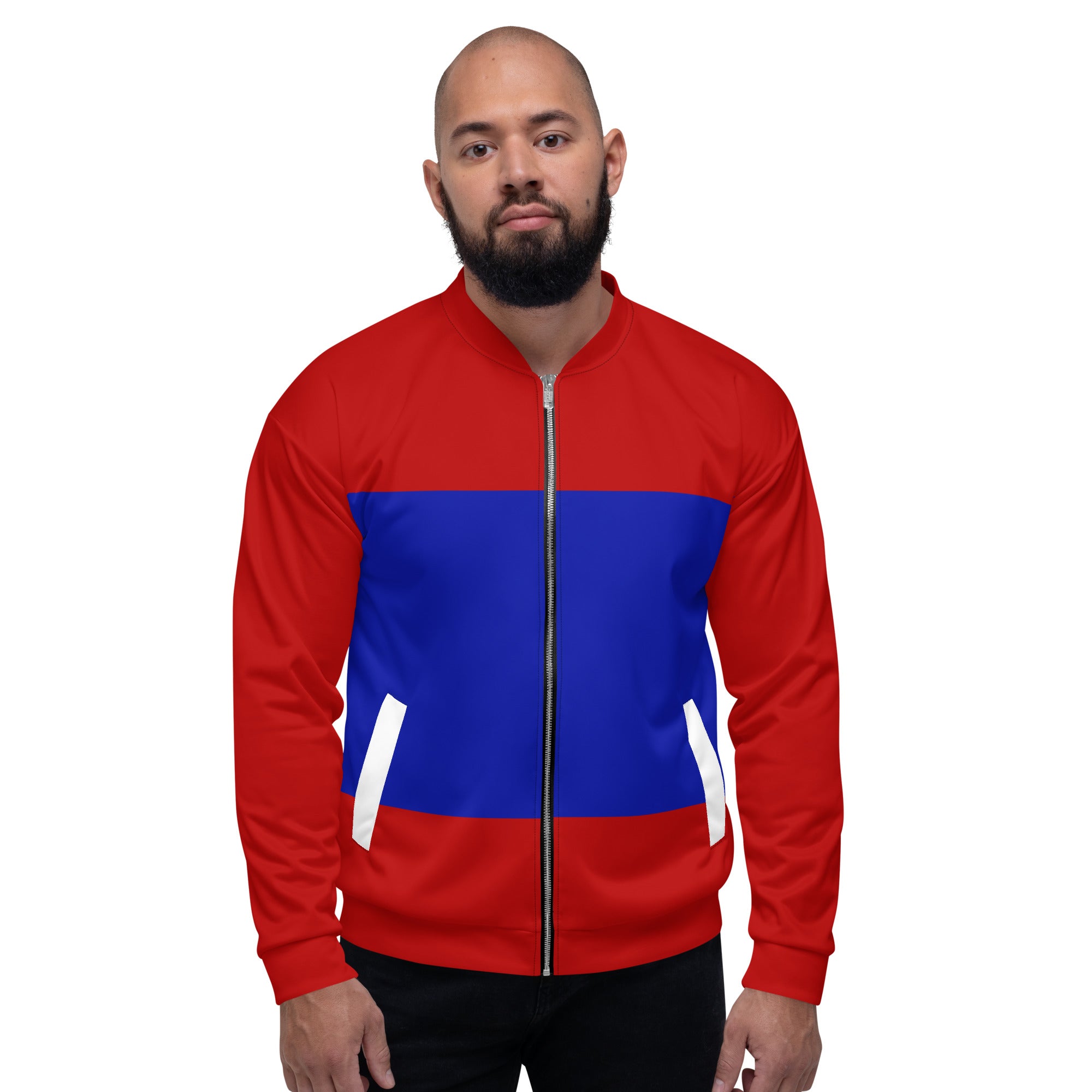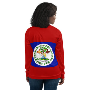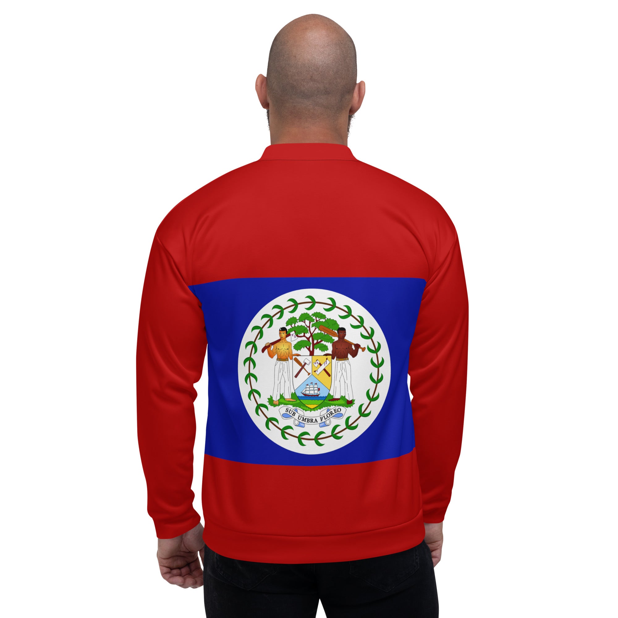 Represent Belize with this unisex bomber jacket based on the Belize flag. With a brushed fleece inside, and a relaxed unisex fit, it's comfortable and effective. Be patriotic with your daily routine.
