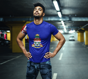 Represent Cayman Islands with this men's athletic t-shirt based on the Cayman Islands flag. With a comfortable, ventilated construct, it's perfect for sports or working out. Be patriotic with your daily routine.