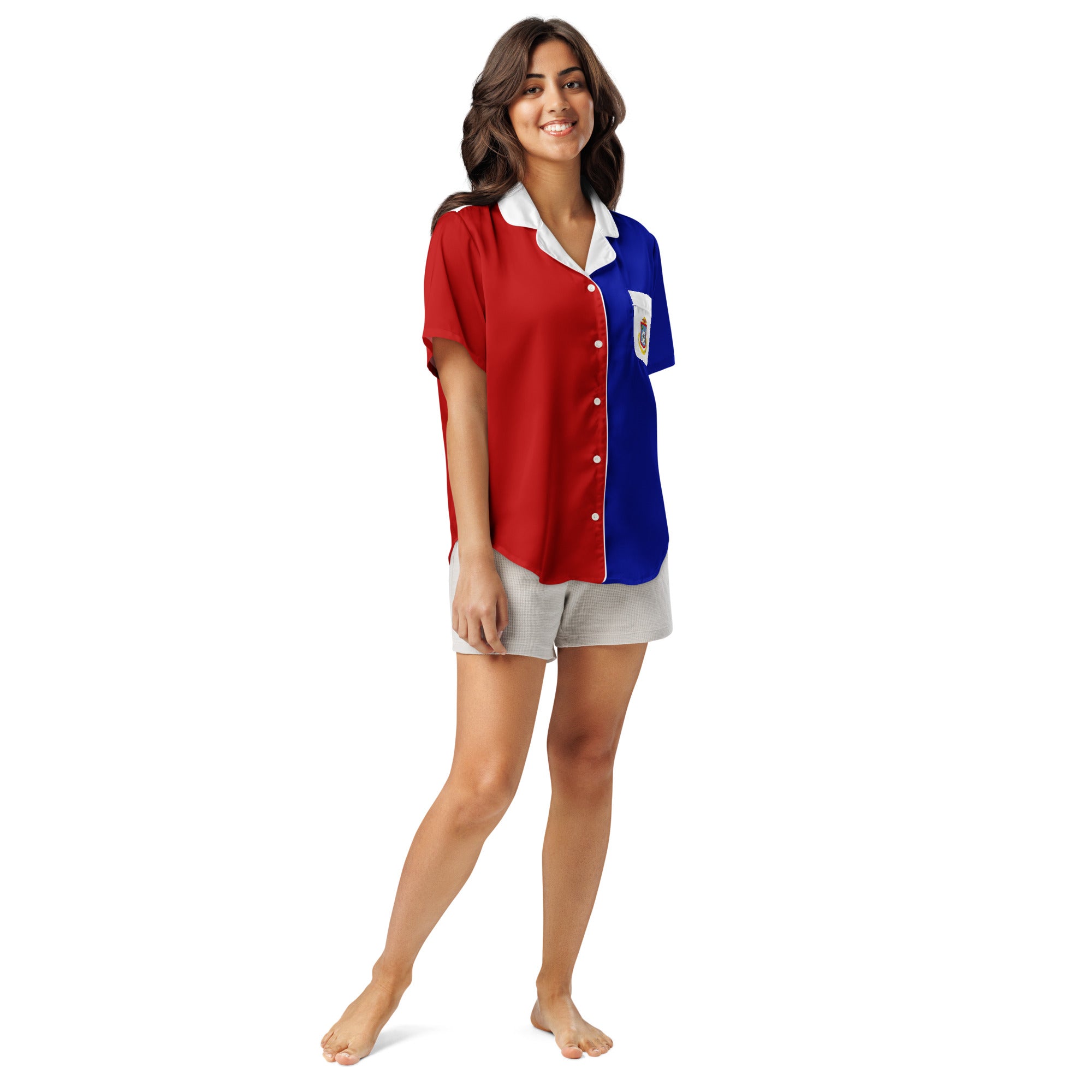 Represent Sint Maarten with this pajama top built for comfort and designed for patriots. This silky-feel pajama top is wonderful as part of nightwear and doubles as stylish loungewear. The high-quality satin material will make you feel comfy, beautiful, and pampered. Rep Sint Maarten with every move.