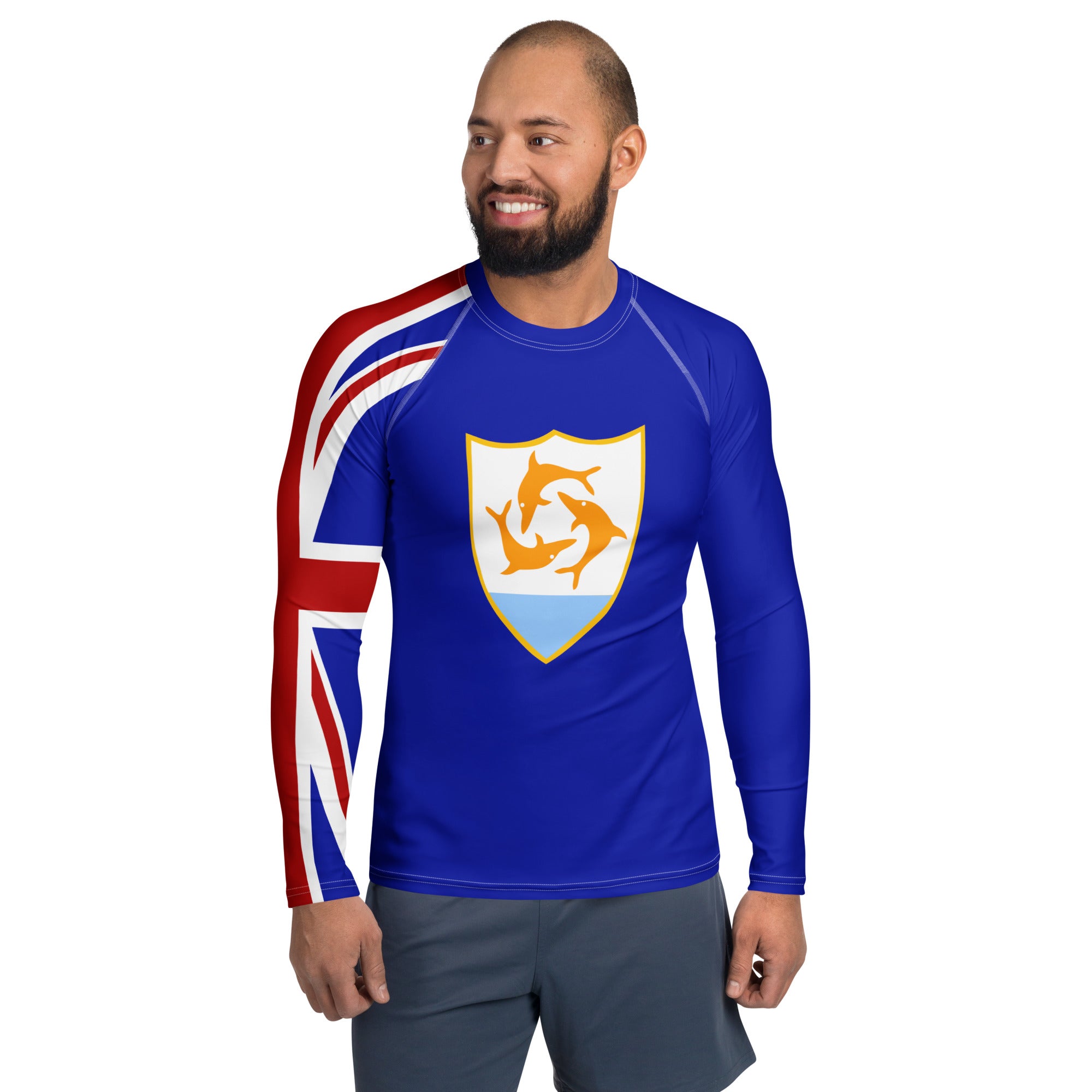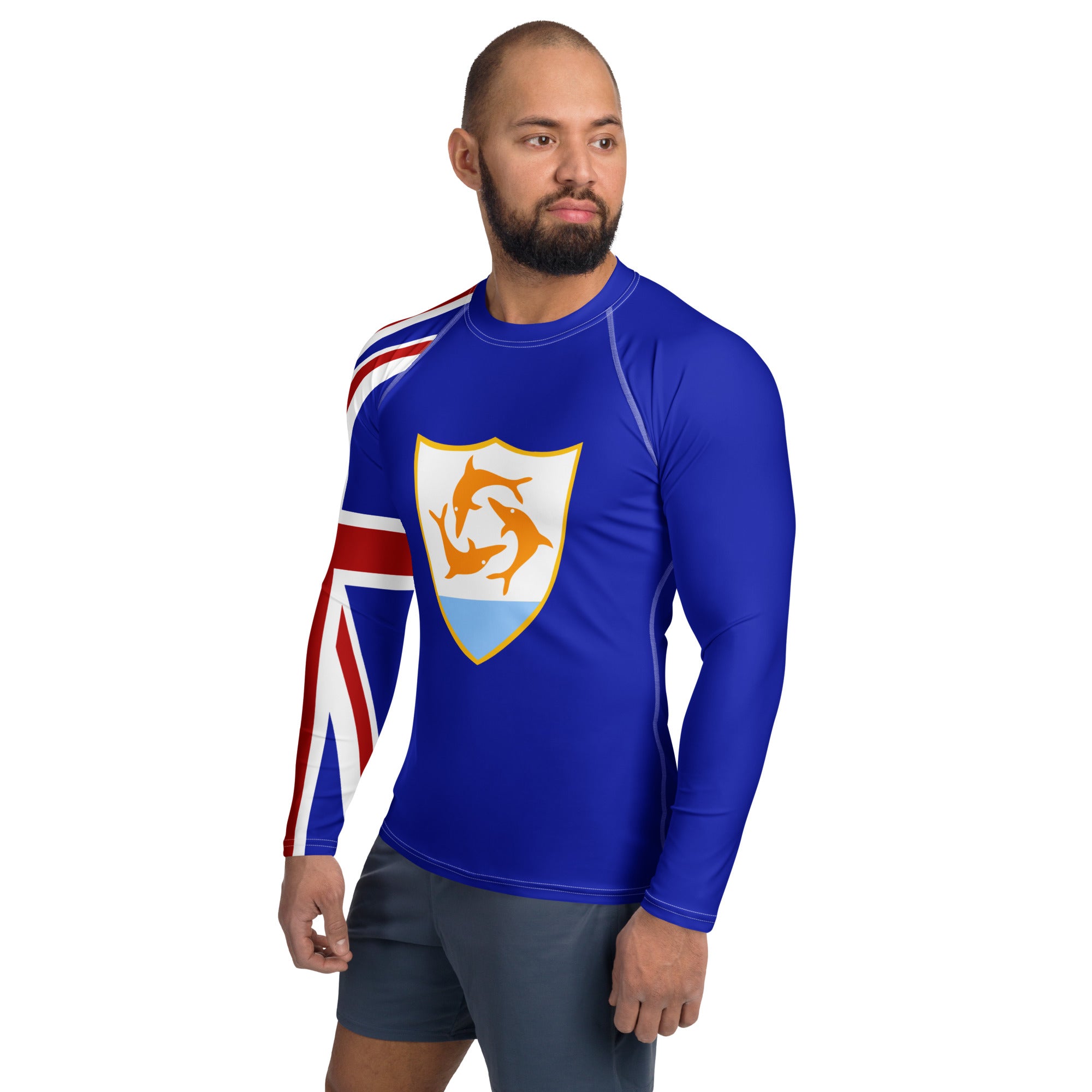 Represent Anguilla with this Rash Guard built for performance and designed for patriots. Whether you're riding the waves, training hard, or just soaking up the island vibes, this sleek, long-sleeve rash guard keeps you protected while showcasing your Anguilla pride. With a slim, athletic fit, ergonomic flat seams, and premium four-way stretch fabric, it moves with you effortlessly. UPF 50+ protection shields you from the Caribbean sun, and the extended length ensures a secure, comfortable fit for any adventure. Rep Anguilla with every move.