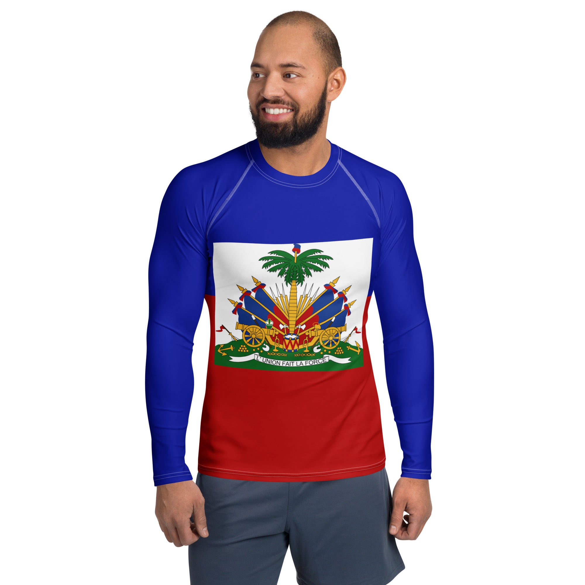 Represent Haiti with this Rash Guard built for performance and designed for patriots. Whether you're riding the waves, training hard, or just soaking up the island vibes, this sleek, long-sleeve rash guard keeps you protected while showcasing your Haiti pride. With a slim, athletic fit, ergonomic flat seams, and premium four-way stretch fabric, it moves with you effortlessly. UPF 50+ protection shields you from the Caribbean sun, and the extended length ensures a secure, comfortable fit for any adventure. Rep Haiti with every move.