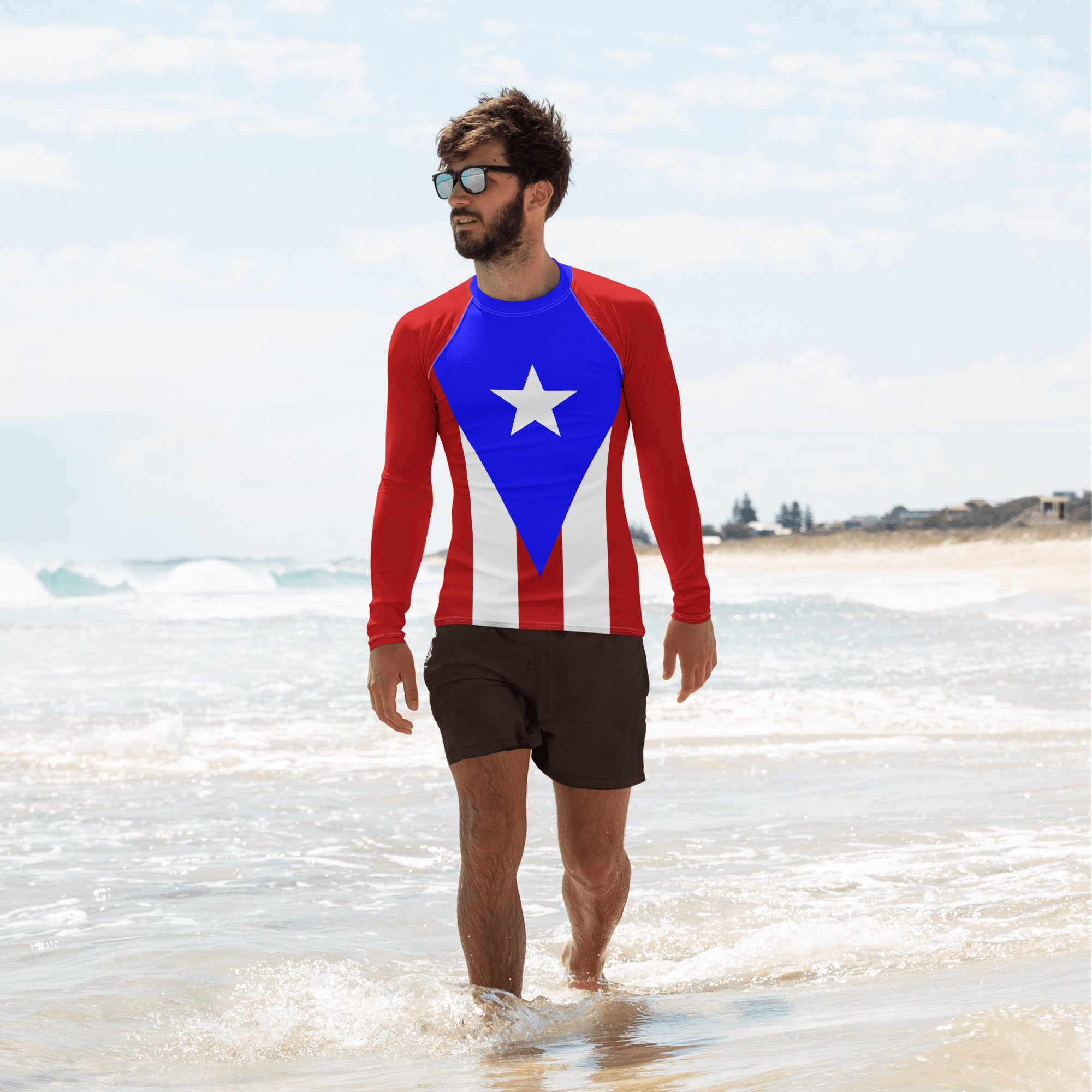 Represent Puerto Rico with this Rash Guard built for performance and designed for patriots. Whether you're riding the waves, training hard, or just soaking up the island vibes, this sleek, long-sleeve rash guard keeps you protected while showcasing your Puerto Rico pride. With a slim, athletic fit, ergonomic flat seams, and premium four-way stretch fabric, it moves with you effortlessly. UPF 50+ protection shields you from the Caribbean sun, and the extended length ensures a secure, comfortable fit for any adventure. Rep Puerto Rico with every move.