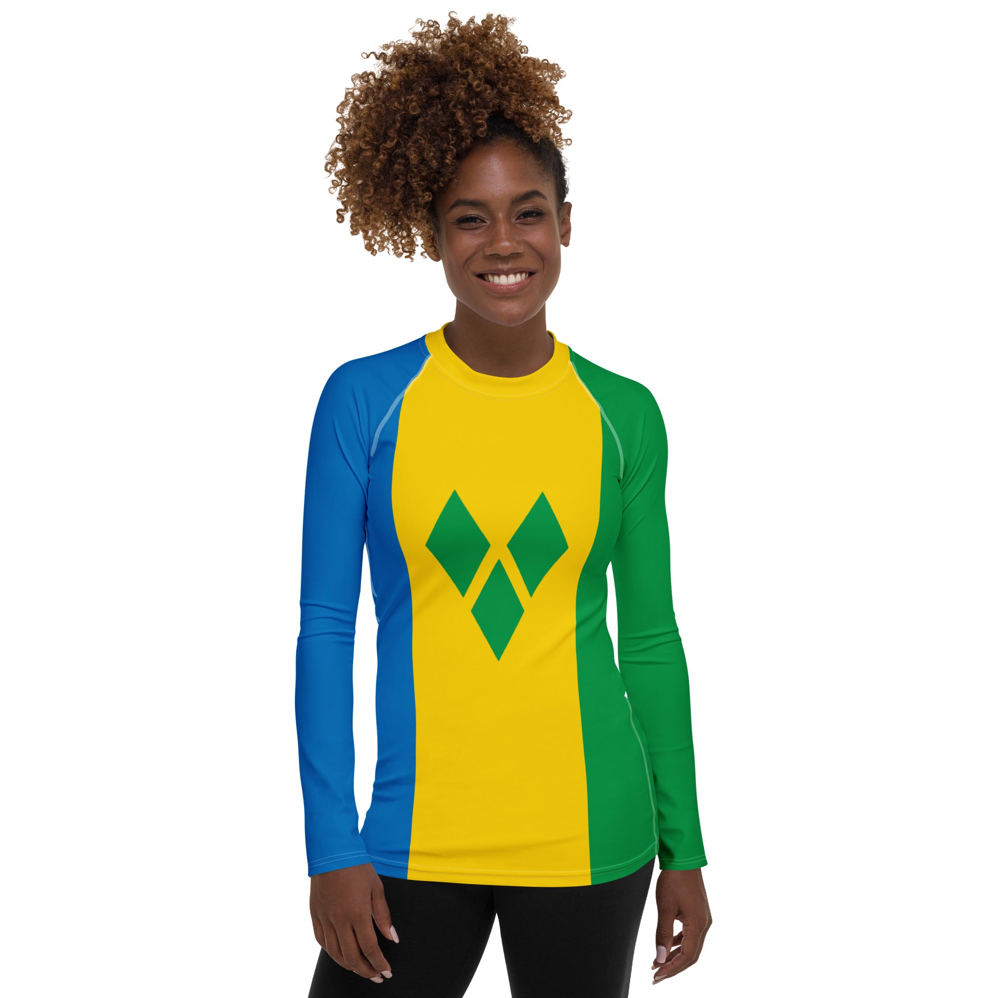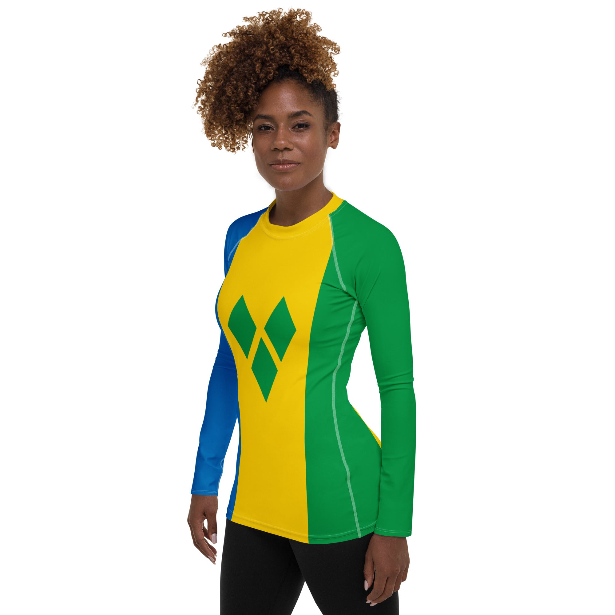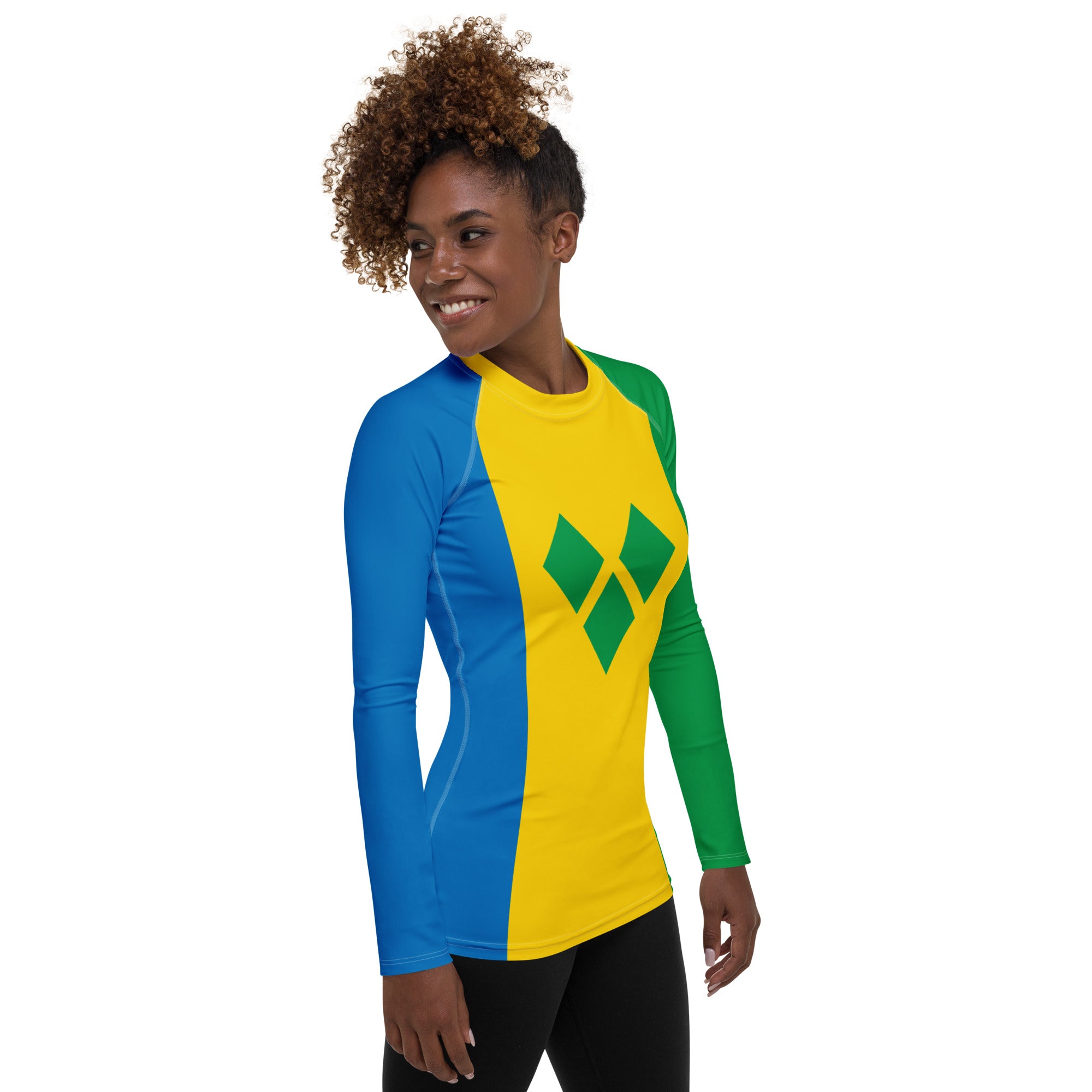 Represent St. Vincent with this Rash Guard built for performance and designed for patriots. Whether you're riding the waves, training hard, or just soaking up the island vibes, this sleek, long-sleeve rash guard keeps you protected while showcasing your St. Vincent pride. With a slim, athletic fit, ergonomic flat seams, and premium four-way stretch fabric, it moves with you effortlessly. UPF 50+ protection shields you from the Caribbean sun, and the extended length ensures a secure, comfortable fit for any adventure. Rep St. Vincent with every move.