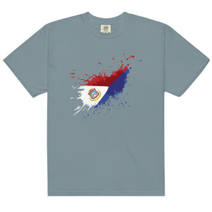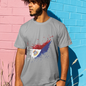 Represent Sint Maarten with this men's t-shirt designed with the Sint Maarten flag in paint splashes and strokes. It's soft, heavy-duty, and will hold up after multiple washings. Be patriotic with your daily routine.
