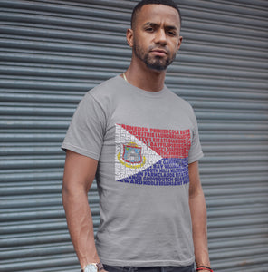 Represent Sint Maarten with this men's t-shirt designed with the Sint Maarten flag stenciled from its towns and cities. It's soft, heavy-duty, and will hold up after multiple washings. Be patriotic with your daily routine.
