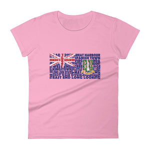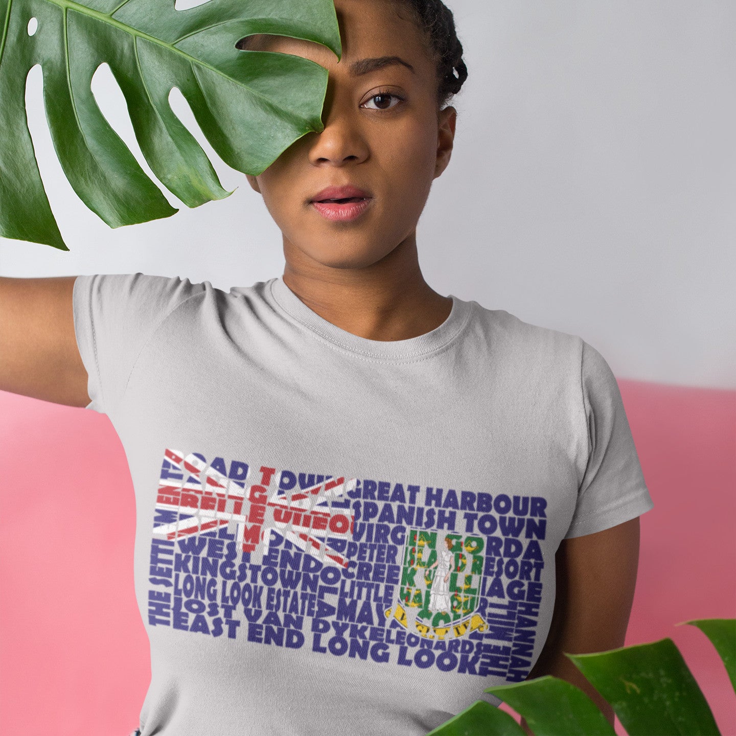 Represent British Virgin Islands with this women's t-shirt designed with the British Virgin Islands flag stenciled from its towns and cities. It's soft, light, and will hold up after multiple washings. Be patriotic with your daily routine.
