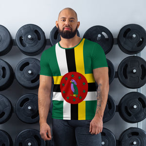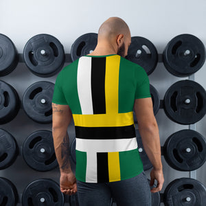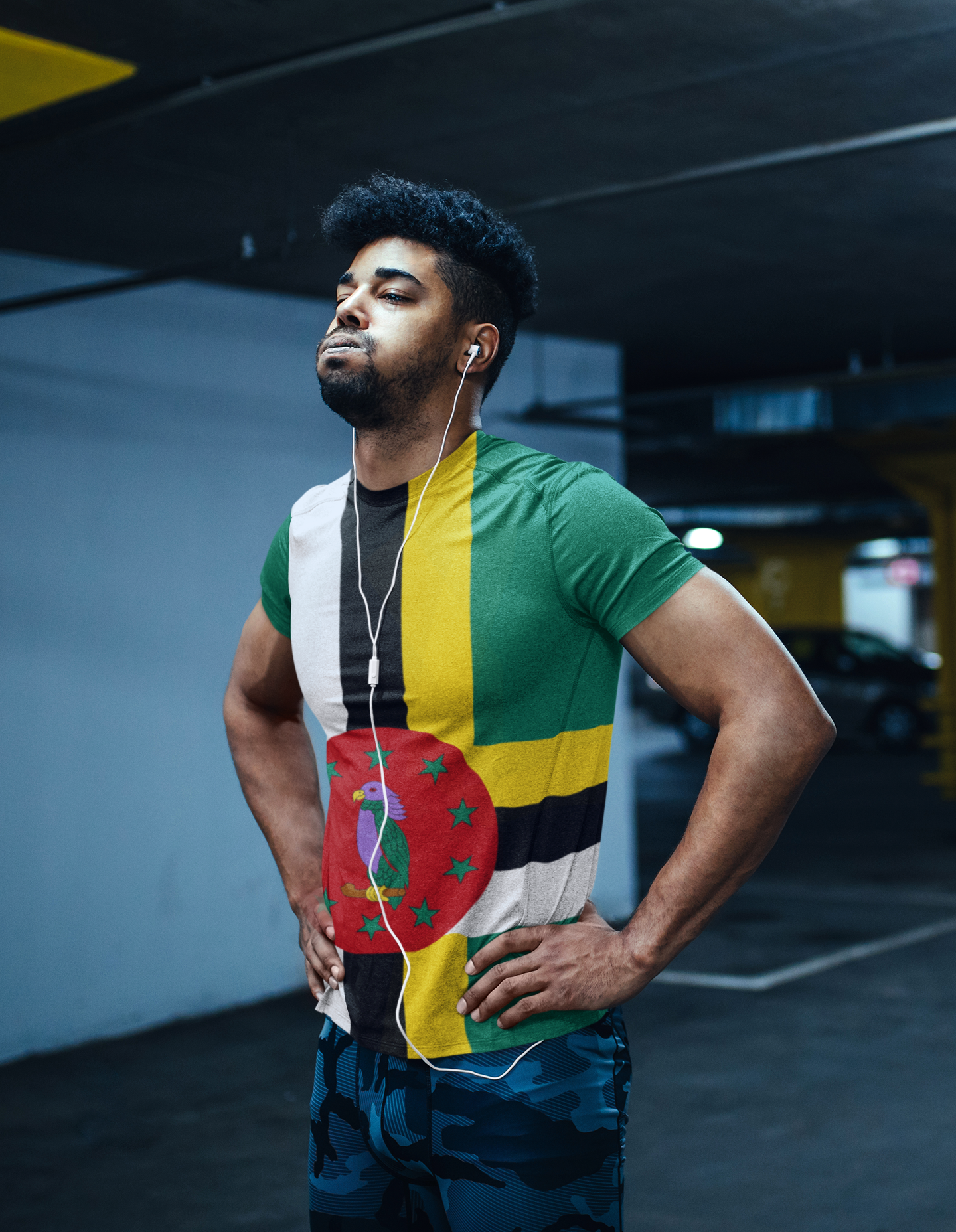 Represent Dominica with this men's athletic t-shirt based on the Dominica flag. With a comfortable, ventilated construct, it's perfect for sports or working out. Be patriotic with your daily routine.