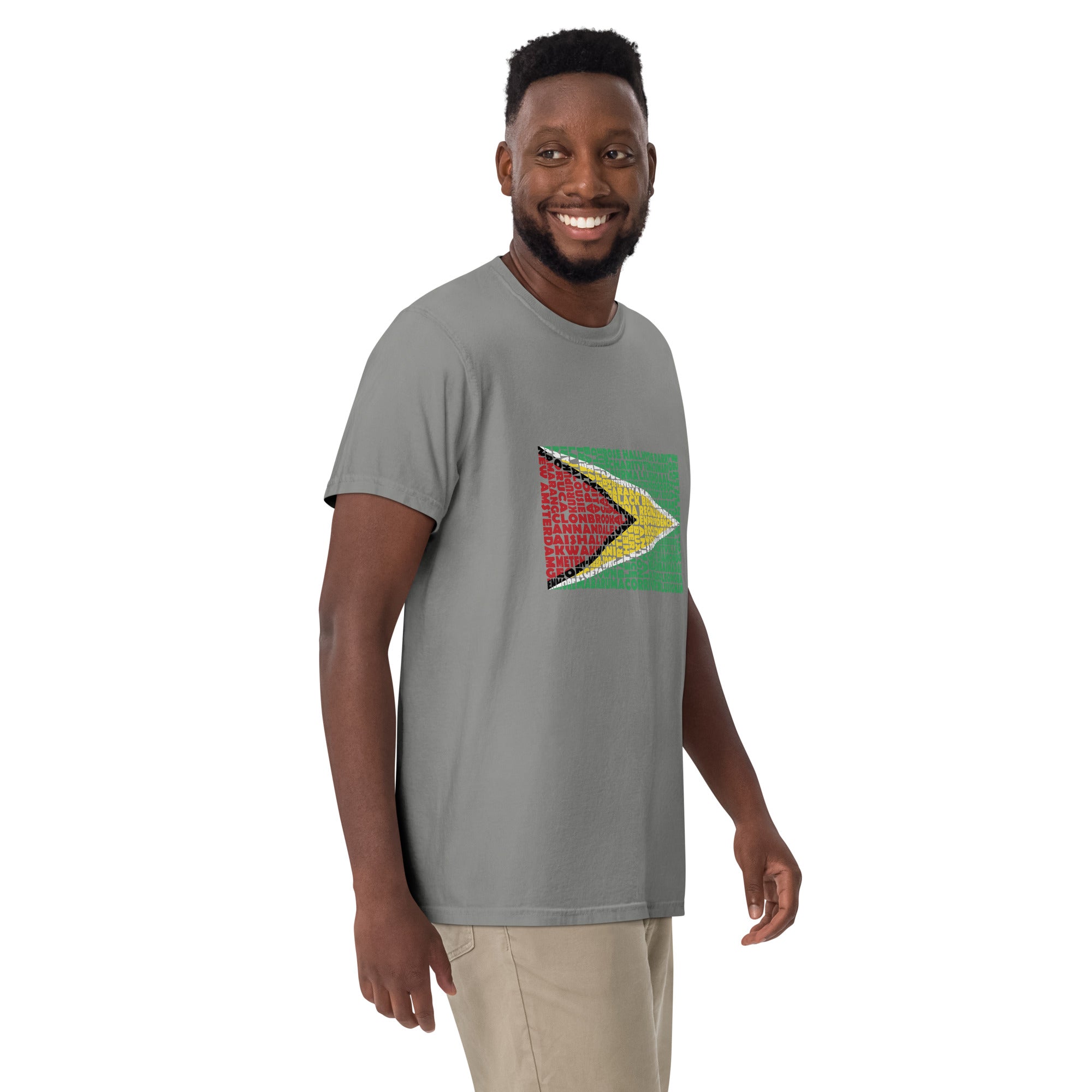 Represent Guyana with this men's t-shirt designed with the Guyana flag stenciled from its towns and cities. It's soft, heavy-duty, and will hold up after multiple washings. Be patriotic with your daily routine.