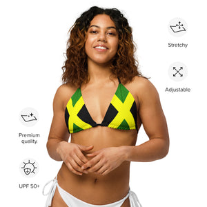 Represent Jamaica with this Padded String Bikini Top designed with the Jamaica flag in mind. The top is has removable padding for comfort and is available in sizes from 2XS to 6XL. Be patriotic with your daily routine.