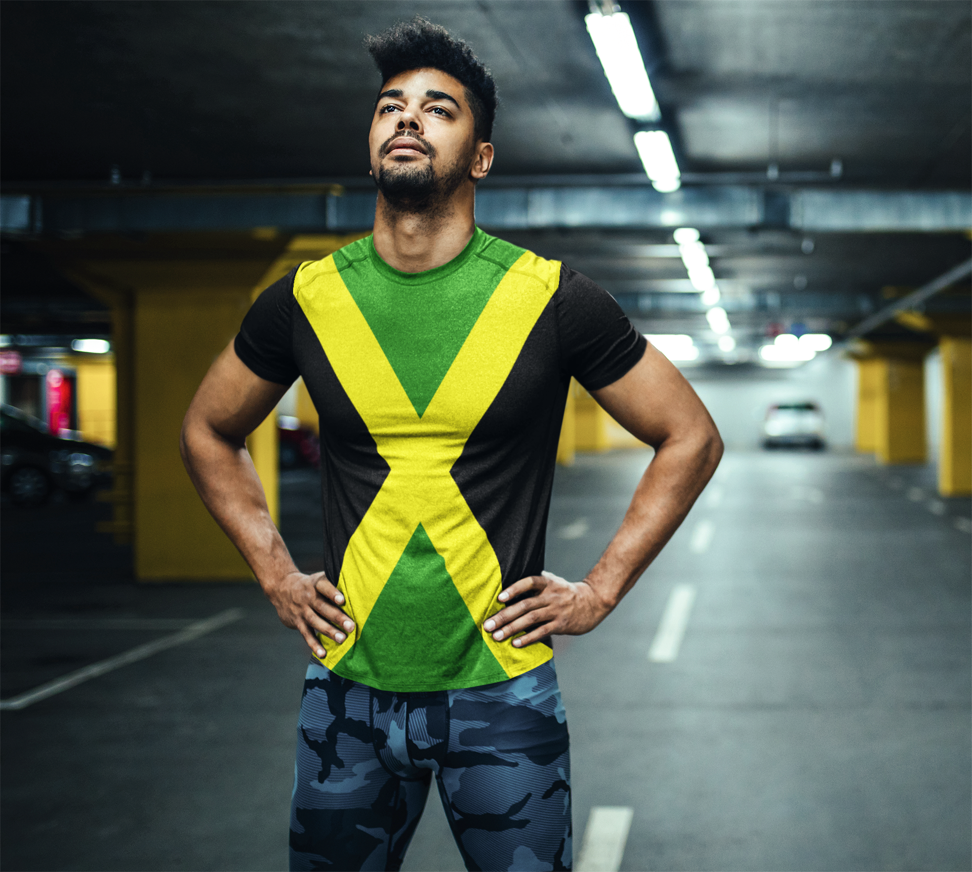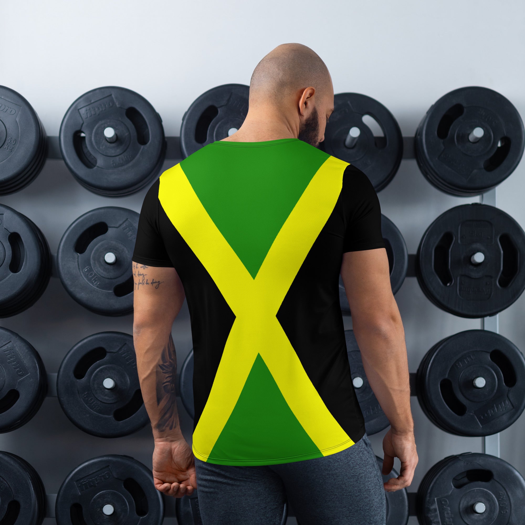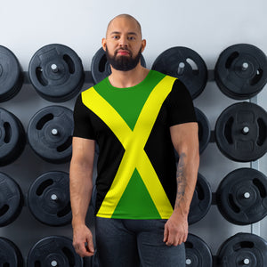 Represent Jamaica with this men's athletic t-shirt based on the Jamaica flag. With a comfortable, ventilated construct, it's perfect for sports or working out. Be patriotic with your daily routine.