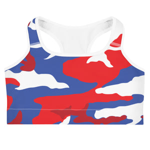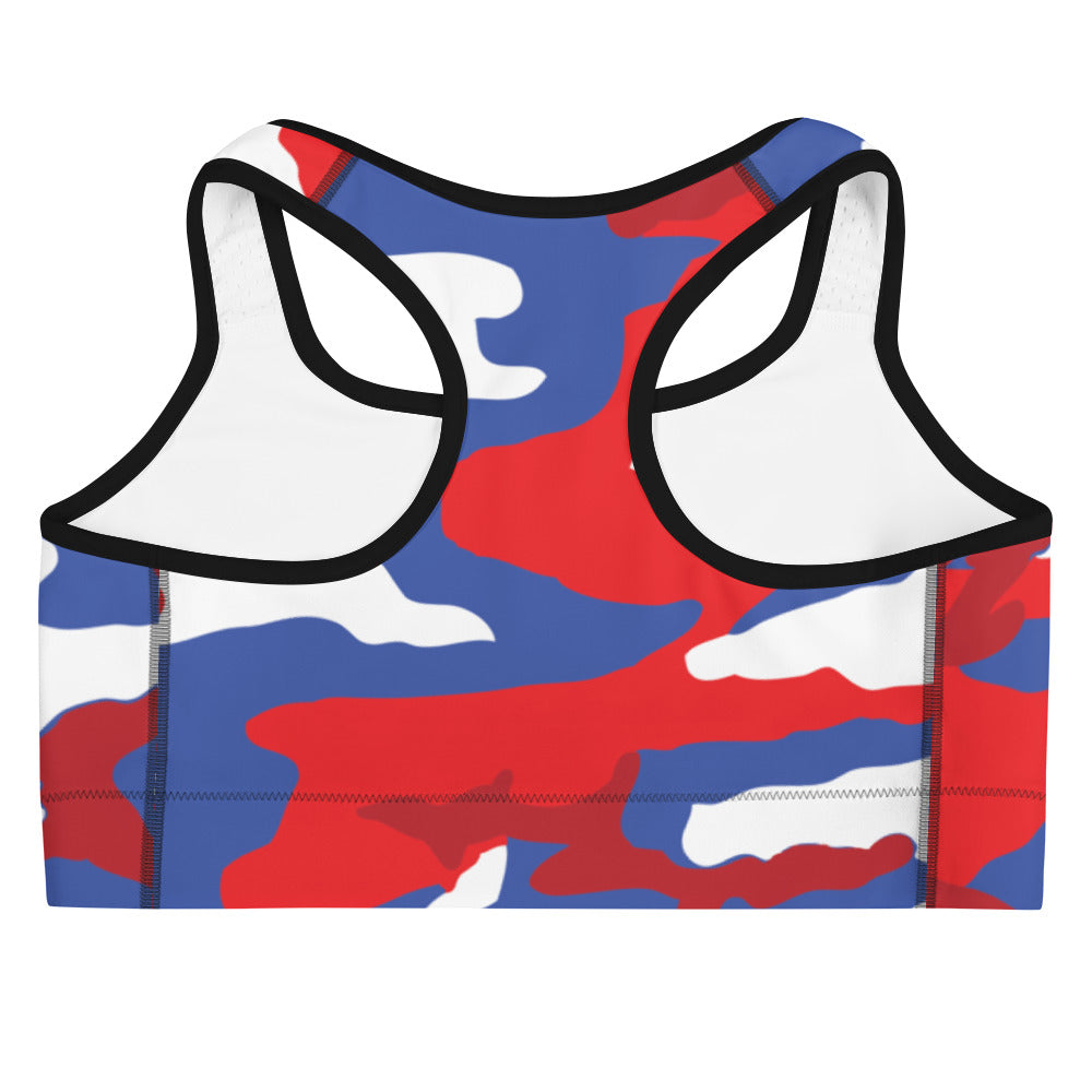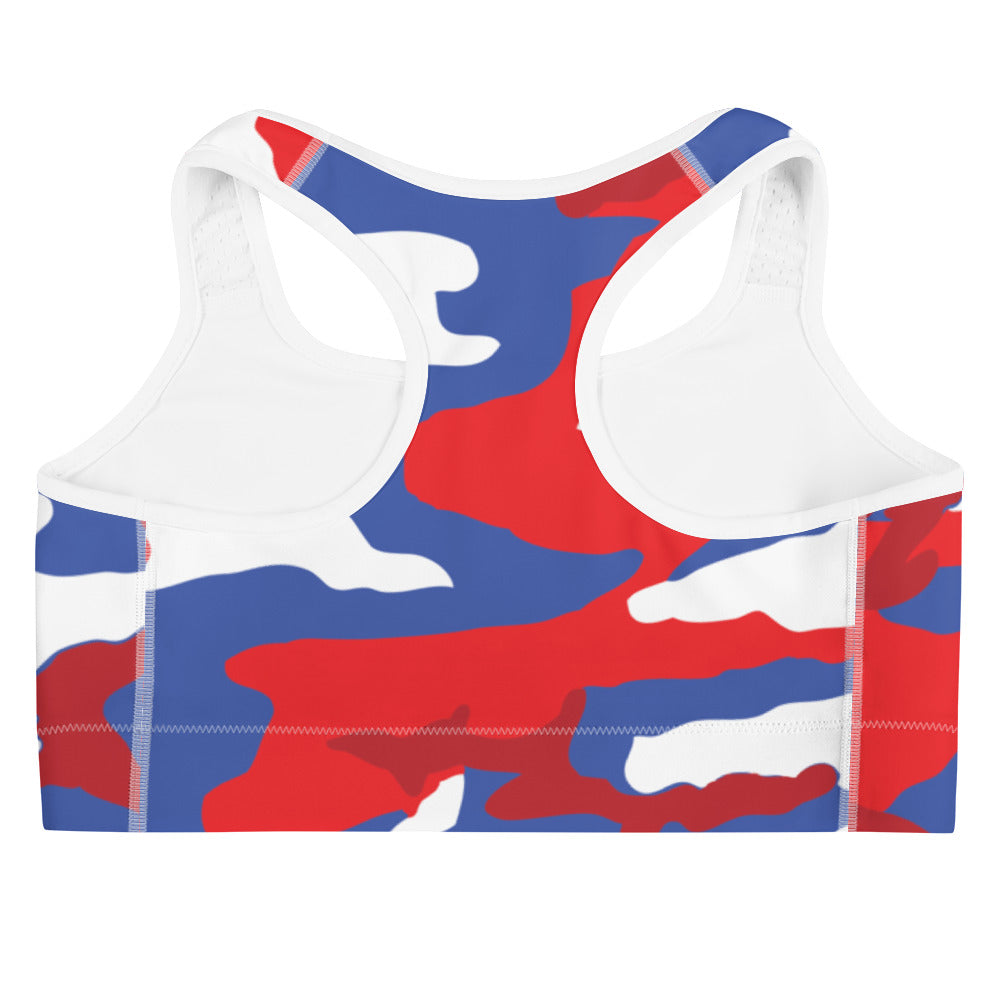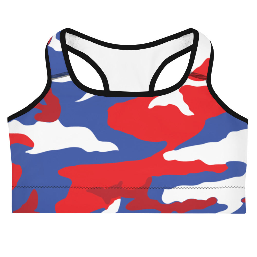 Represent Puerto Rico with this Sports Bra camouflaged in the colors of the Puerto Rico flag. It's made from moisture-wicking material that stays dry during workouts. The shoulder straps are comfy thanks to the support material inside. The front is double-layered with a wide elastic band under the breasts to ensure constant support. Be patriotic with your exercise routine.