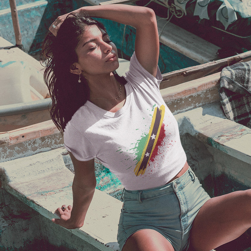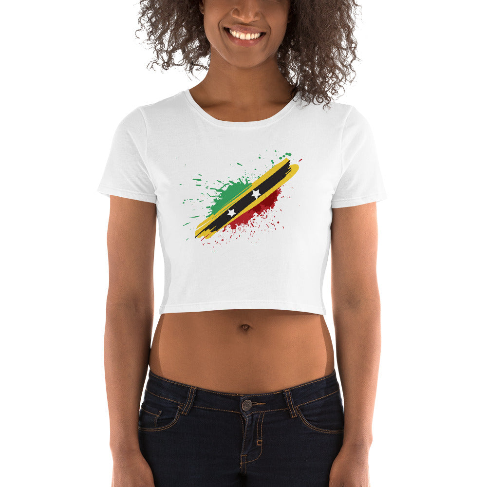 Represent St. Kitts and Nevis with this women's crop top designed with the St. Kitts and Nevis flag in paint splashes and strokes. This cropped tee is slim fit and is perfect for casual wear. Be patriotic with your daily routine.