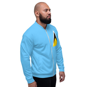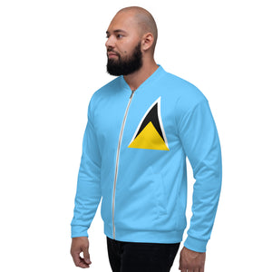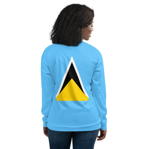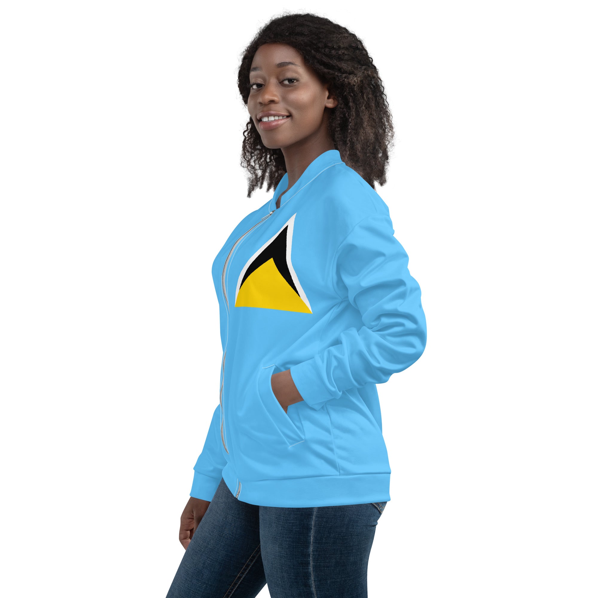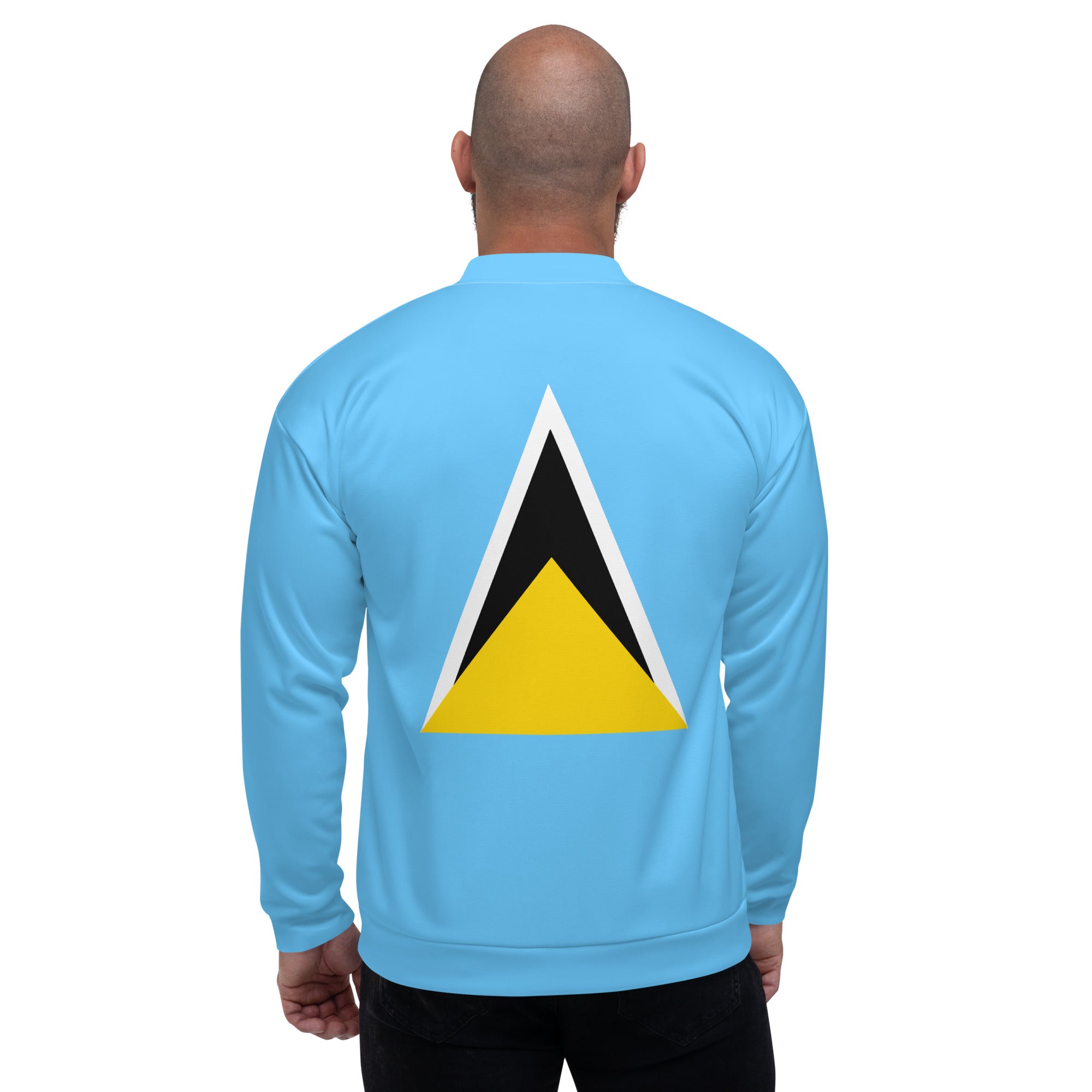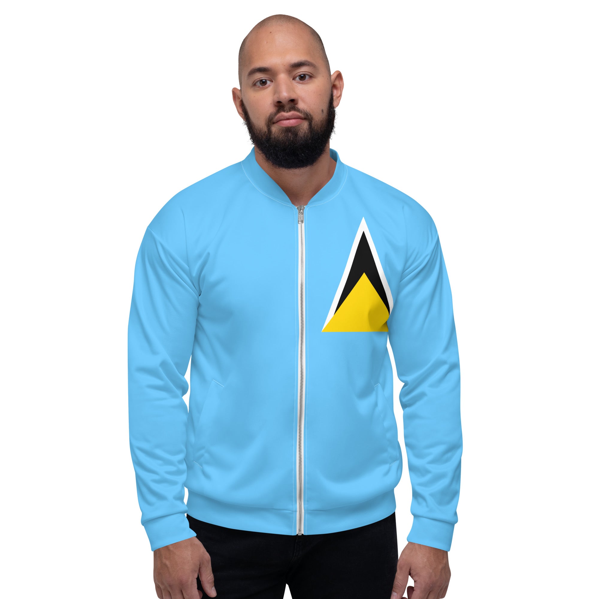 Represent St. Lucia with this unisex bomber jacket based on the St. Lucia flag. With a brushed fleece inside, and a relaxed unisex fit, it's comfortable and effective. Be patriotic with your daily routine.