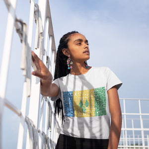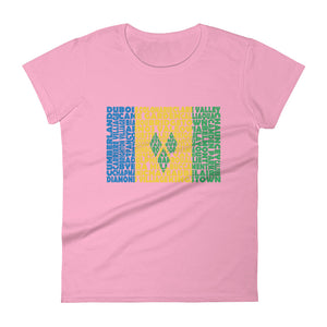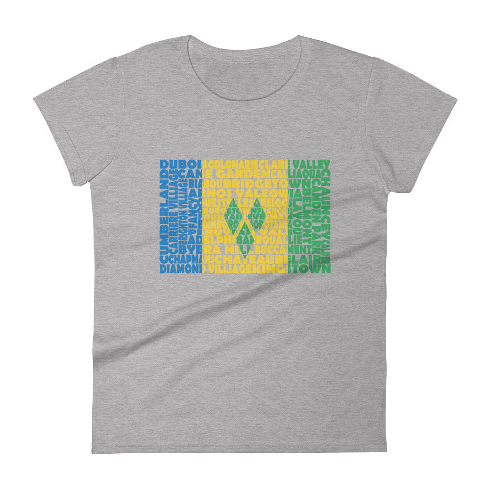 Represent St. Vincent with this women's t-shirt designed with the St. Vincent flag stenciled from its towns and cities. It's soft, light, and will hold up after multiple washings. Be patriotic with your daily routine.