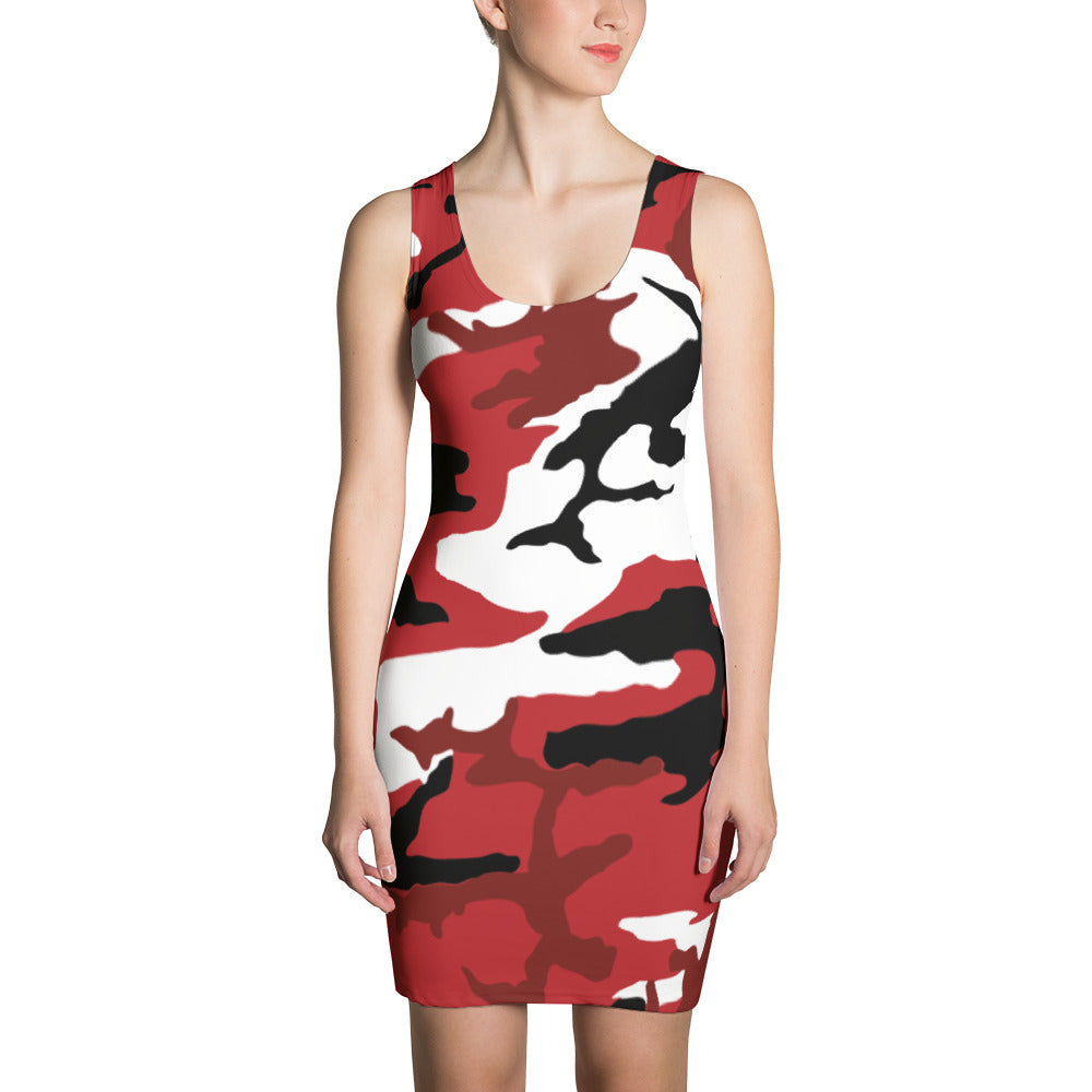 Represent Trinidad and Tobago with this fitted dress camouflaged with the colors of the Trinidad and Tobago flag. It's form fitting, soft, and will hold up after multiple washings. Be patriotic with your daily routine.