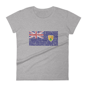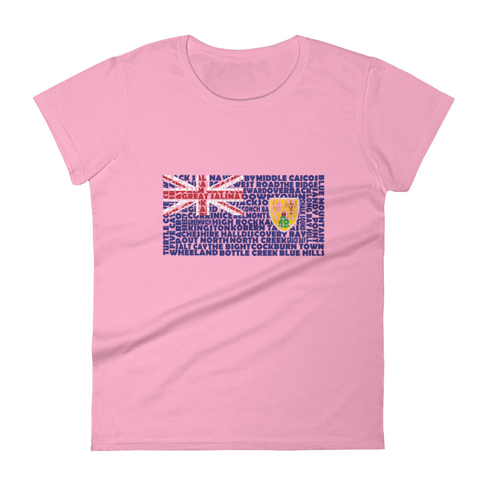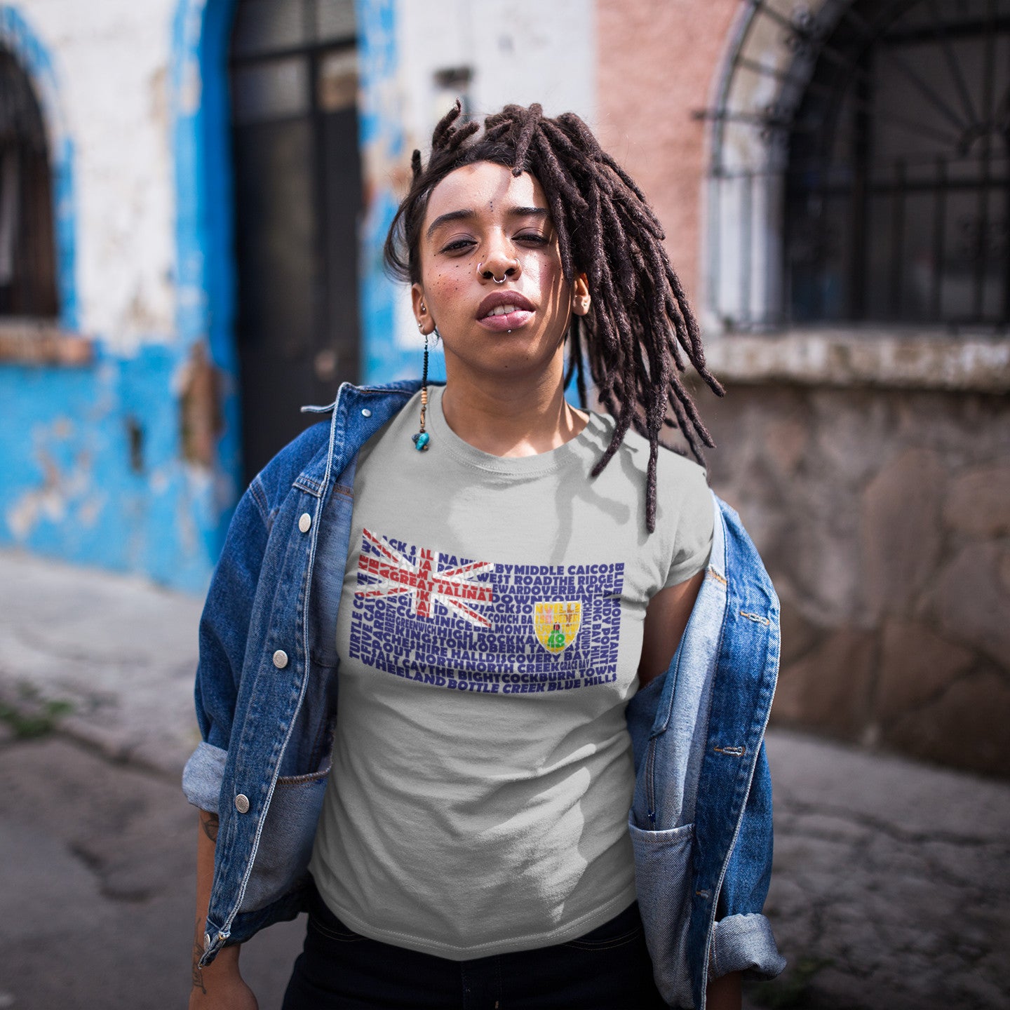 Represent Turks and Caicos with this women's t-shirt designed with the Turks and Caicos flag stenciled from its towns and cities. It's soft, light, and will hold up after multiple washings. Be patriotic with your daily routine.