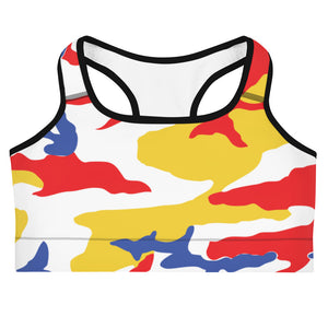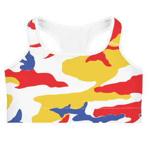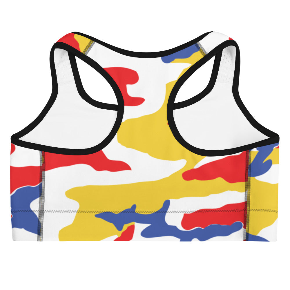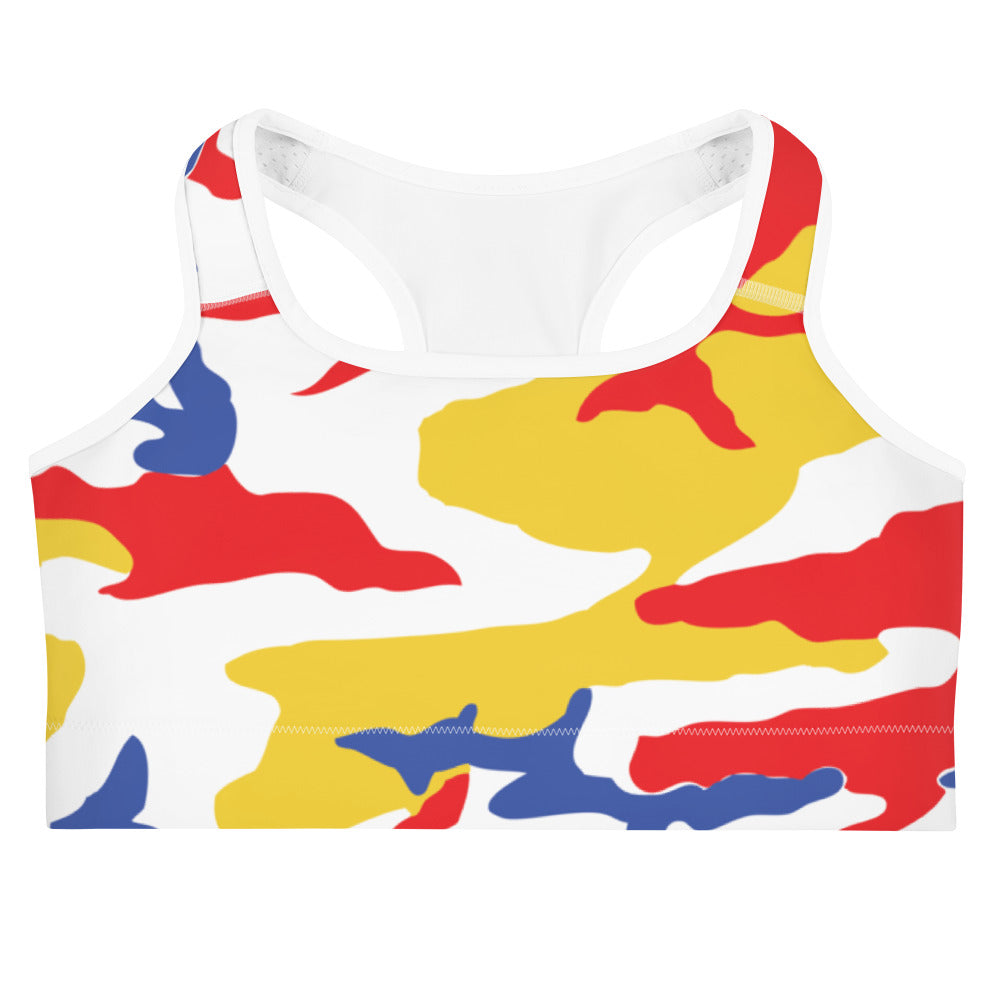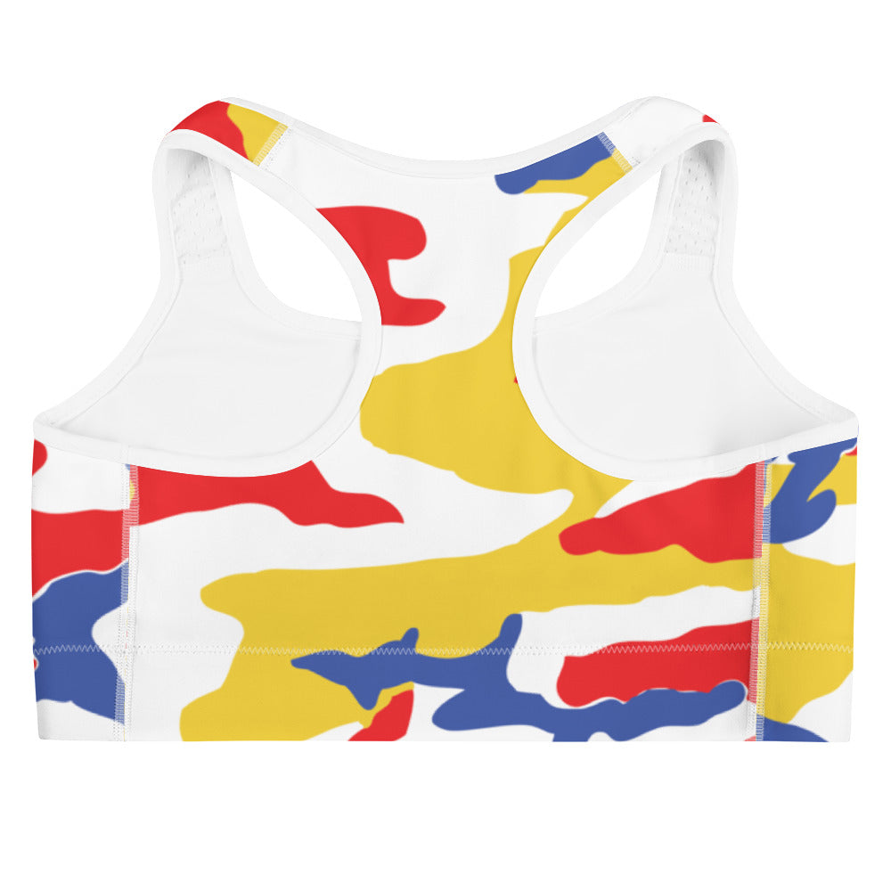 Represent US Virgin Islands with this Sports Bra camouflaged in the colors of the US Virgin Islands flag. It's made from moisture-wicking material that stays dry during workouts. The shoulder straps are comfy thanks to the support material inside. The front is double-layered with a wide elastic band under the breasts to ensure constant support. Be patriotic with your exercise routine.